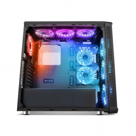 - Potente sistema de ventilación. Con cuatro potentes ventiladores LED RGB de 140 mm preinstalados (tres en el frontal y uno en la parte trasera), Hummer TGX Rainbow permite instalar en su parte superior 3 ventiladores extra (de 120 o de 140mm). Para mantener unos niveles óptimos de temperatura en el interior del equipo, Hummer TGX Rainbow cuenta, además, con un compartimento inferior donde ubicar PSU y discos duros, que evita la transferencia de su calor al resto de componentes.