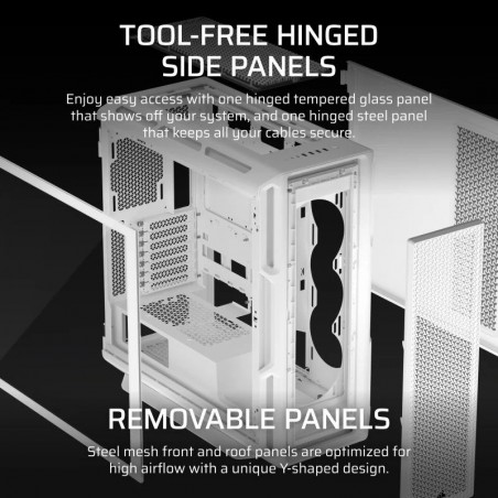 - Dos paneles laterales con bisagras sin herramientas - Disfruta de un acceso fácil con un panel de vidrio templado con bisagras que muestra tu sistema y un panel de acero con bisagras en el otro lado.