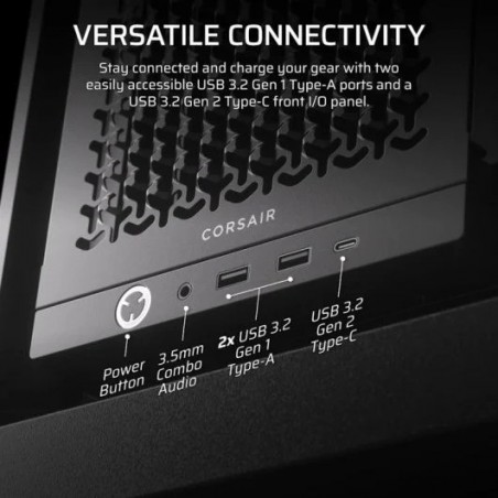 - MODERNO PANEL FRONTAL DE E/S. Deja las conexiones a su alcance, con un puerto USB 3.2 Gen 2 de tipo C, dos puertos USB 3.2 Gen 1 de tipo A, y un conector de micrófono y audio.