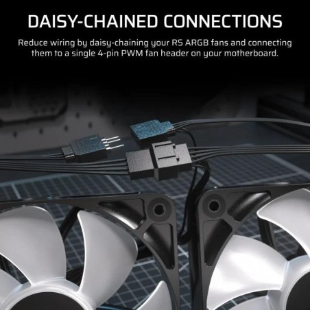 - CONEXIONES?EN CADENA. Simplifique el cableado de su sistema conectando sus ventiladores RS en cadena a un único conector de ventilador PWM de 4 pines en su placa base.