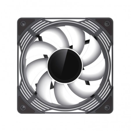 - Ventilador ARGB 120mm (120×120×25mm) con marco negro y 9 aspas semitransparentes blancas.